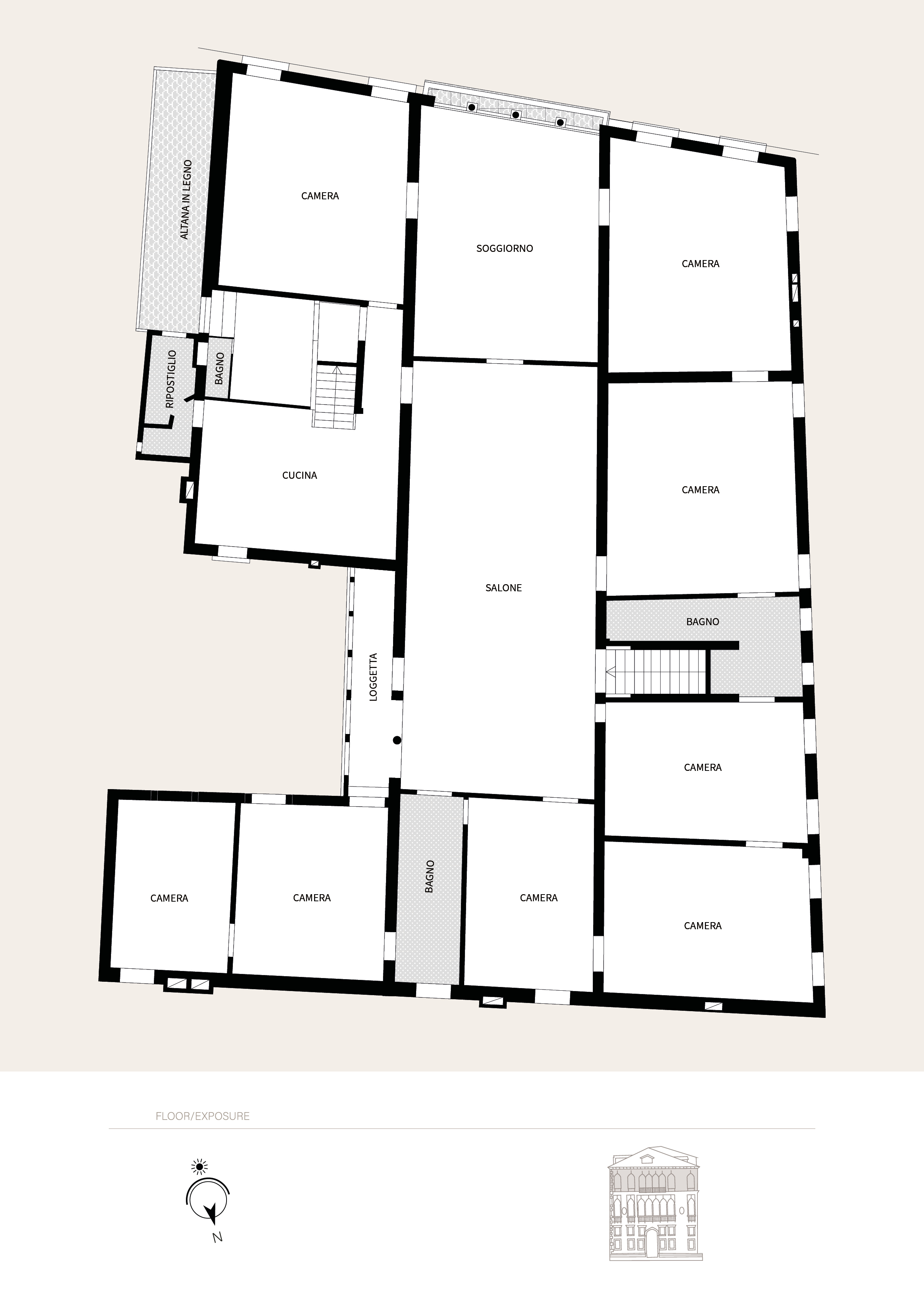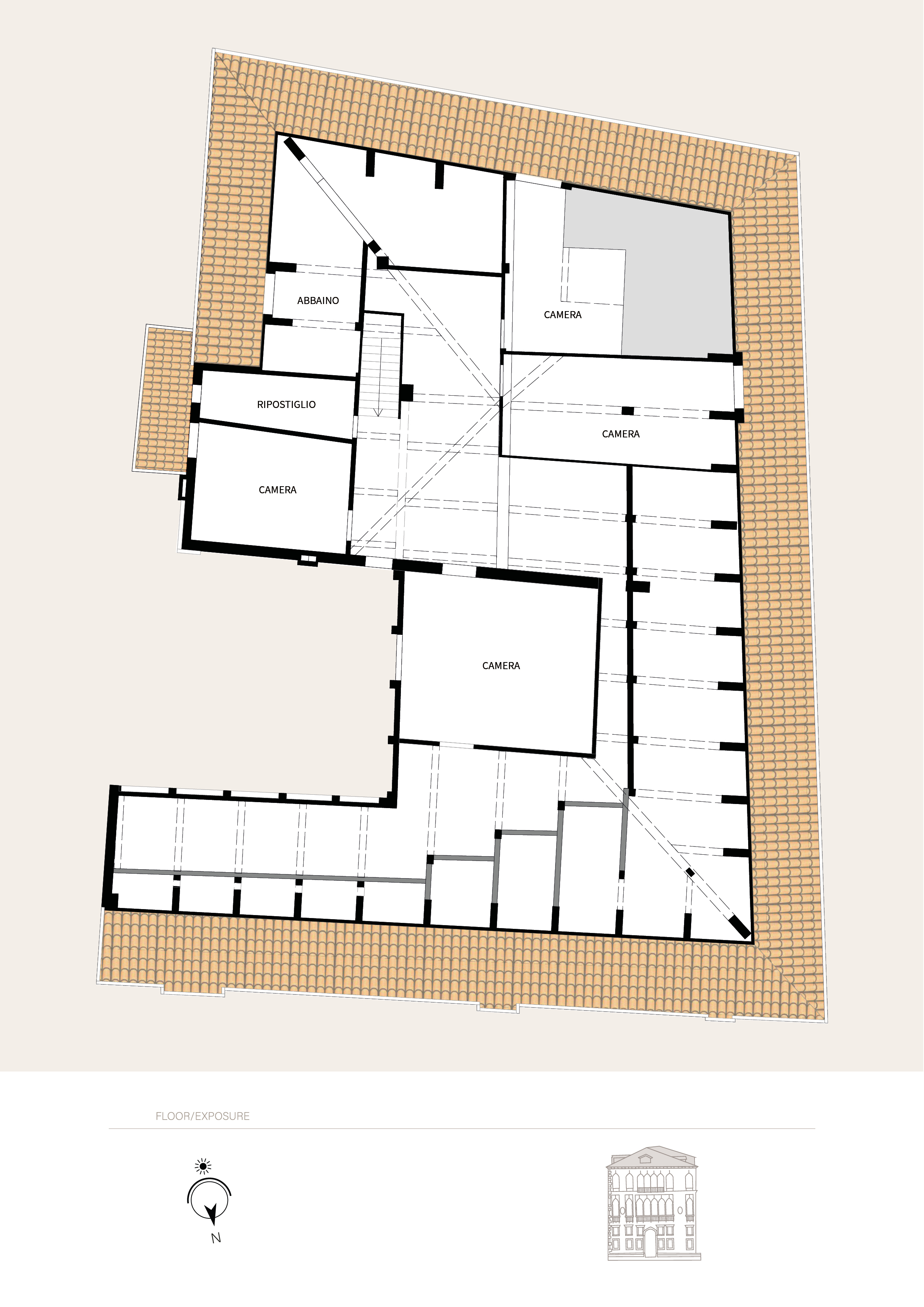 The property also includes an “altana” (rooftop terrace) with views over the Venetian rooftops and offers further development potential on the upper level. Here, an approximately 400-square-meter attic, while in need of restoration, presents a real opportunity to create additional space for the main apartment or a separate living unit with impressive exposed chestnut beams.