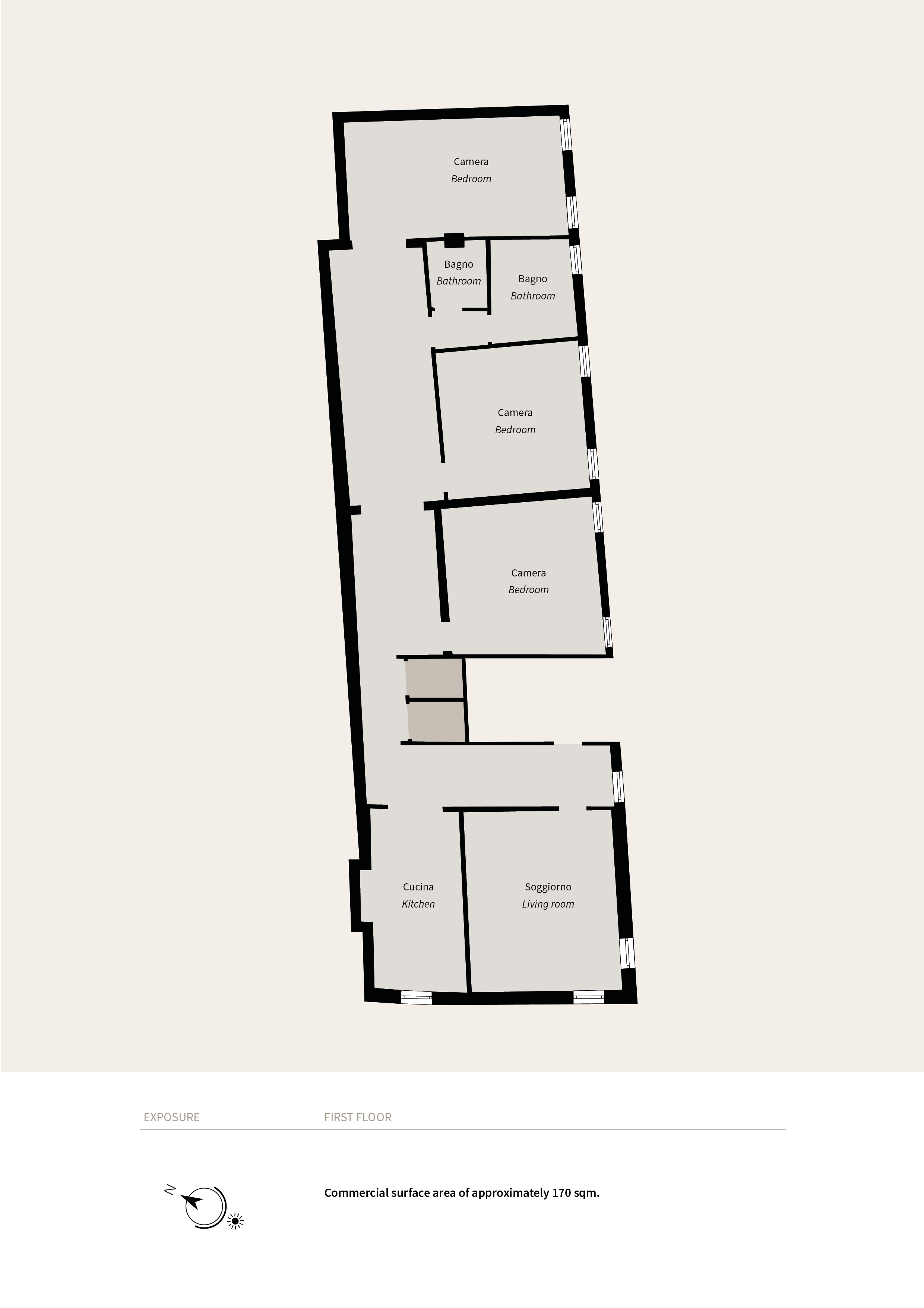 The entrance opens onto a generous landing, with the potential to create a second access on the opposite side. From here, a windowed corridor leads to two east-facing rooms, both enjoying beautiful canal views: one featuring a charming double corner window, the other offering a glimpse towards the Grand Canal. A wide internal corridor, accentuated by high ceilings and a practical under-stair storage area, leads to the sleeping quarters, which comprise two double bedrooms and one triple bedroom. The apartment also includes two full bathrooms, one of which is large, windowed, and recently renovated.