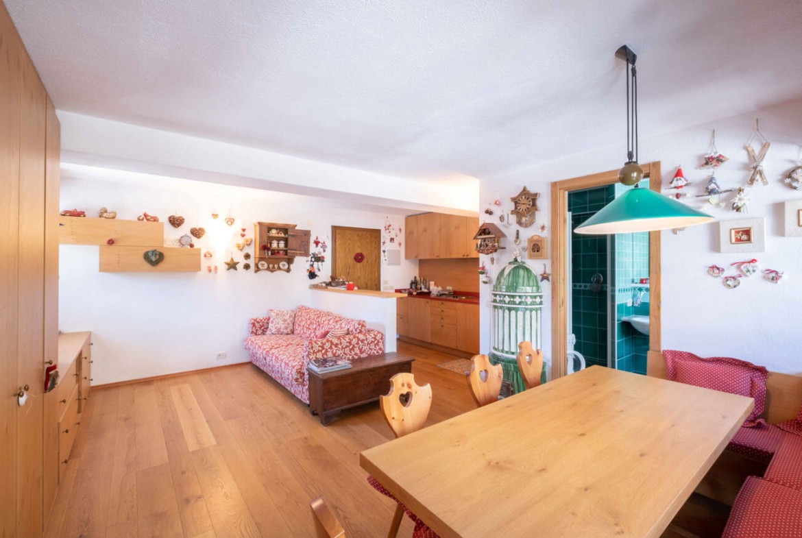 For sale, a spacious studio apartment in Corvara in Badia located on the 2nd floor of a tranquil condo-hotel in Corvara in Badia. The studio apartment offers an entrance, an ample living/sleeping room with a queen size bed and two foldaway beds, and a bathroom with a shower. A balcony facing north overlooking Mt. Sassongher, an outdoor parking space, and a shared ski room complete this property.