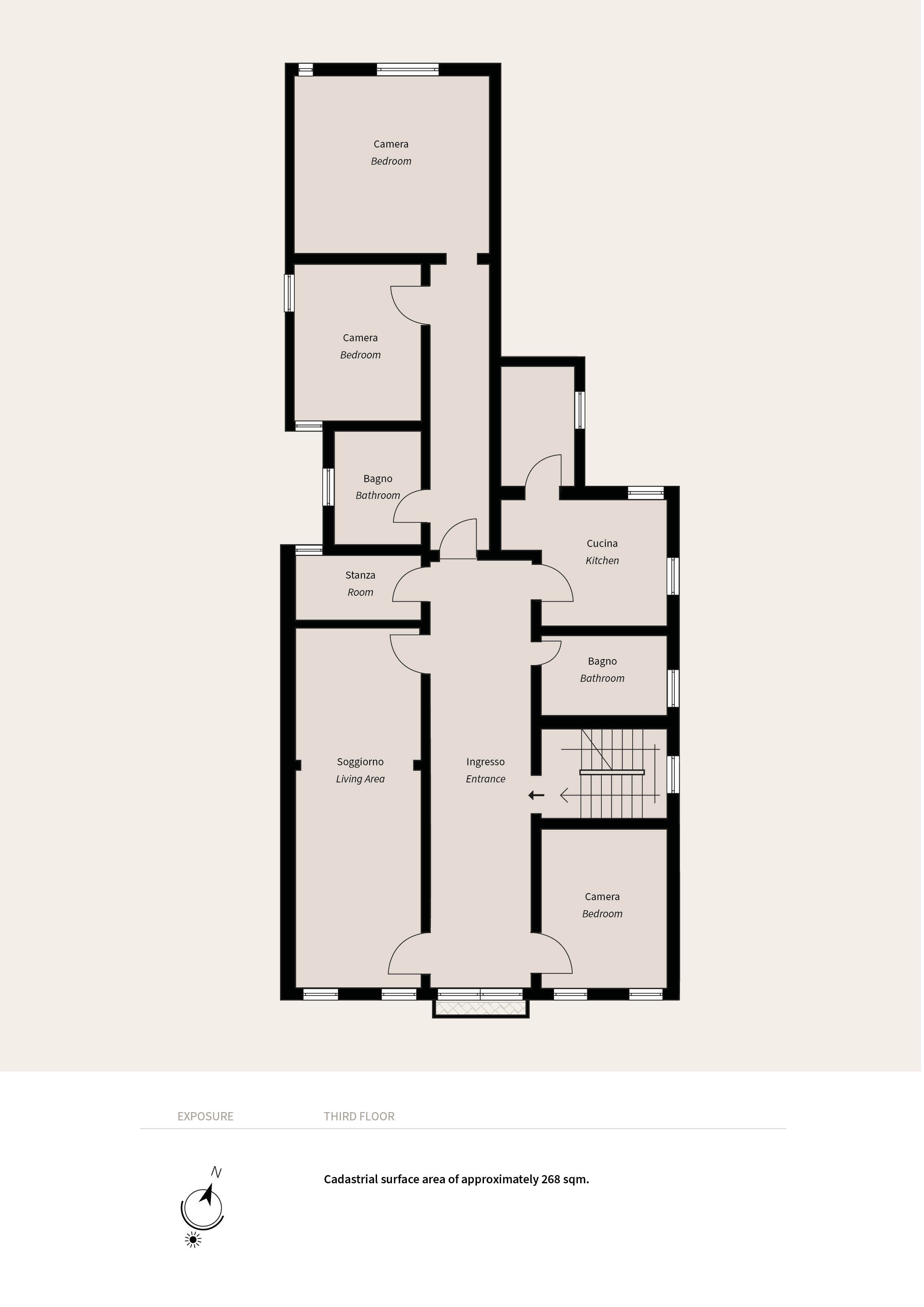 The entrance opens into a magnificent central salon, the true heart of the home. This airy, light-filled space is defined by exposed timber beams and an elegant Venetian double-arched window (bifora) with a small balcony, offering quintessential views of the city. The layout is exceptionally generous: Two spacious rooms flow directly from the central salon; a large eat-in kitchen, two further oversized bedrooms (triple-occupancy potential), and two well-proportioned single bedrooms; two full, windowed bathrooms.