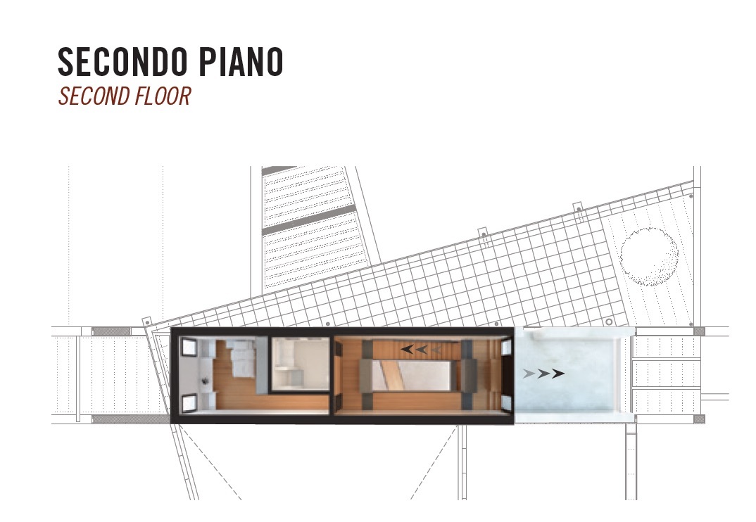Attraverso una scala e passerella sospesa, in acciaio e rivestite in legno, si accede al piano secondo il quale è così composto: