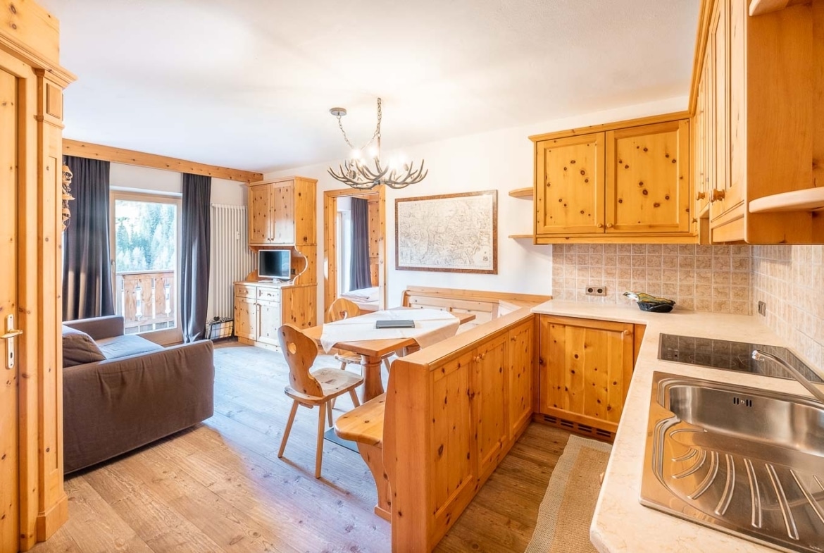 A pochi passi dagli hotel, ristoranti più rinomati del centro di San Cassiano e gli impianti Piz Sorega, l’appartamento è così composto: